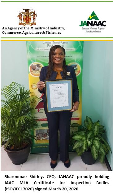 On January 20, 2020, the IAAC MLA Group agreed via electronic ballot that the Jamaica National Agency for Accreditation (JANAAC) is accepted as an IAAC MLA signatory for the scope of Inspection Bodies (under ISO/IEC 17020).